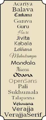 Stylistic Alternates: (salt) Cankama, Garava, Jivita, Lekhana, Mandala, Odana, Pali, Sukhumala, Talapanna, and Verajja have Decorative Drop Capitals that use this feature. My fonts use a contextual substitution, so only the first capital letter of a word is substituted.