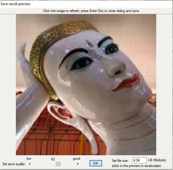 New JPG saving option: Show preview image. Drag the slider to adjust the quality; the file size is calculated. Set the file size; the quality is calculated. The preview shows the result. Can be combined with Try to save with original JPG quality (estimation); the slider position is preset to the estimated quality, but can be adjusted.IrfanView 4.58