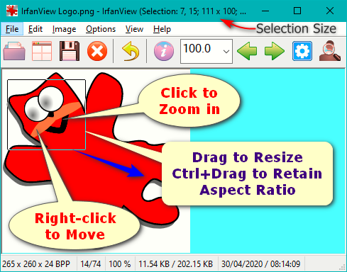 The author's preference is for function over form, and minimalist commands. Where most programs use Ctrl Key combinations, IrfanView often uses an alphanumeric key alone, or one with shift. Selection is done by dragging a marquee with the mouse in the usual way. The cursor then changes its form and function as you move it across the marquee. Grab the sides with the arrows to resize the mask, or click with the magnifying glass to zoom in. Right click to move the selection.