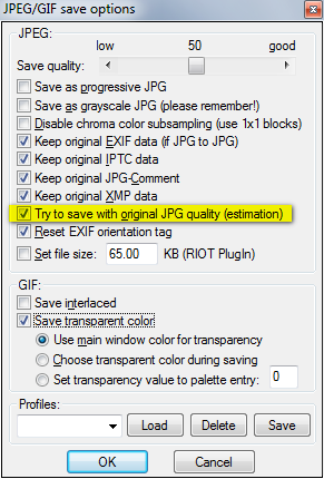 On saving a JPG image, there is now an option to estimate the original compression/quality ratio use to create the original image, and to use that in place of the slider value.