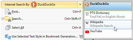 Custom search engines can be added, manually sorted, or deleted. The last used search is shown on the context menu, with other searches being available on a submenu.