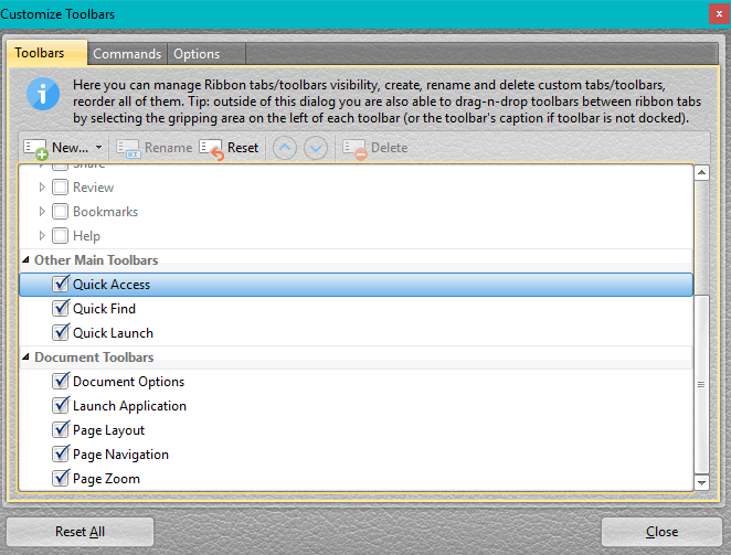 All of the toolbars can be docked in a single row or expanded to show all of the tools. Each toolbar has an arrow to collapse or expand it. If there is insufficient space to show the text labels, they are hidden. Text labels can also be hidden always via the Customize Toolbars, Options.