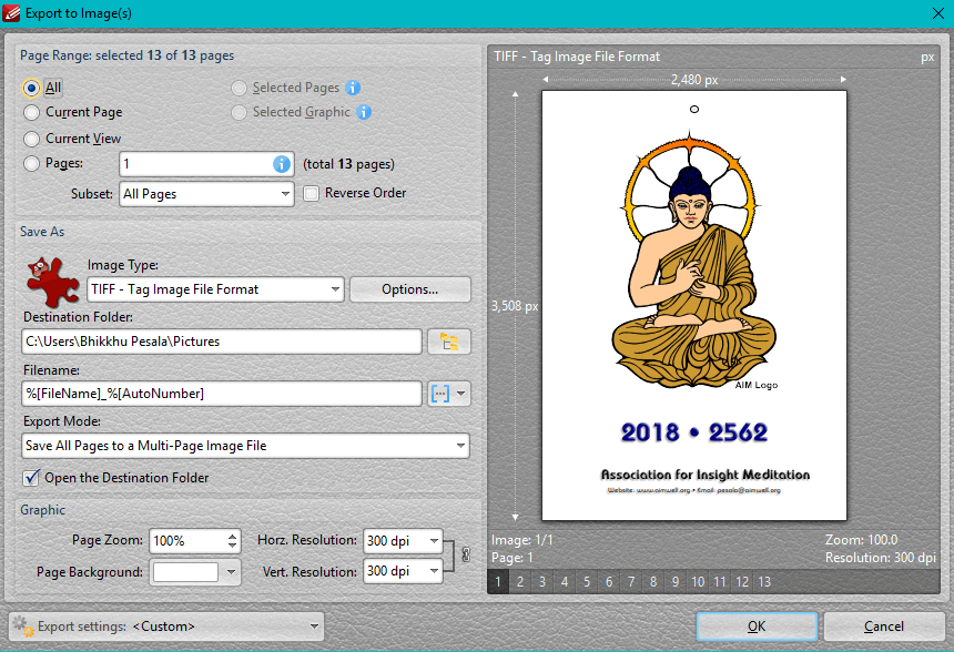 Export any document to a Multi-page TIFF image, or to any of the popular image formats — PNG, GIF, JPG PCX, or BMP — and some other formats I am not familiar with. Set the resolution to 50 dpi or 2,400. Change the page background colour or make it transparent. Automatically assign file names to the images with variables. This very powerful feature is available even in the free version of the Editor. I used it to export 12 pages of my PDF Calendar to 12 JPG images to use as thumbnails on my News Page. Now all I have to do is to remember to update the thumbnail each month.