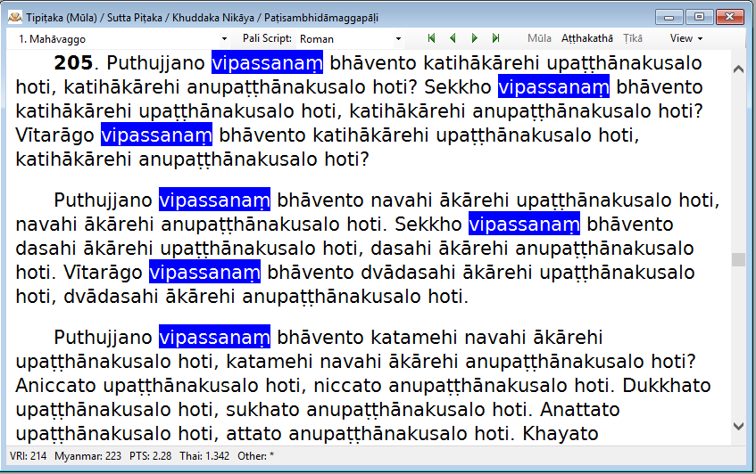 The hintline at the bottom of the Window gives a reference to the books of the different publications of the Tipiṭaka: VRI = Vipassanā Research Institute, PTS = Pali Text Society.
