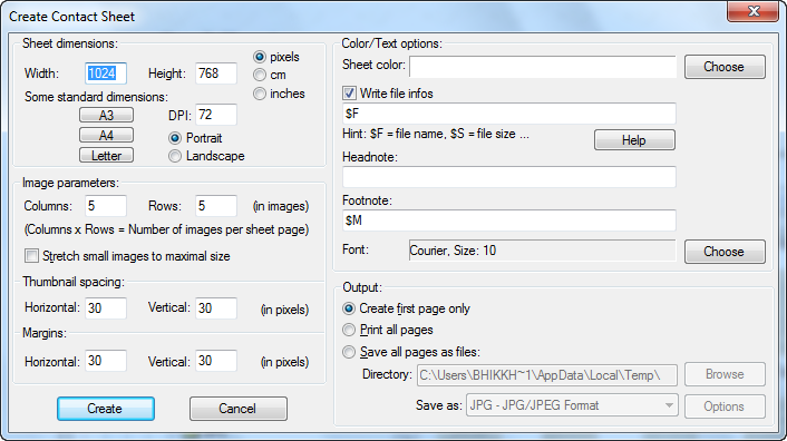 Then choose the number of rows and columns, and the spacing in pixels between rows and columns. Choose a sheet colour if you don’t want white, and chose the font for the text labels, which can contain file information such as the filename, file type, dimensions, or metadata. See the help file for an extensive list of parameters to use in the text fields. The footnote (footer) appears in the margin at the bottom of the contact sheet.